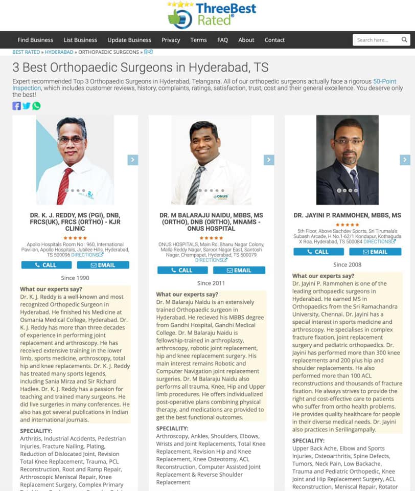Dr. Balaraju Naidu has once again been recognized in 2026 as one of the Top Orthopaedic Surgeons in Hyderabad, Telangana, as evaluated and selected by ThreeBestRated®, a USA-based independent business review and rating organization.
