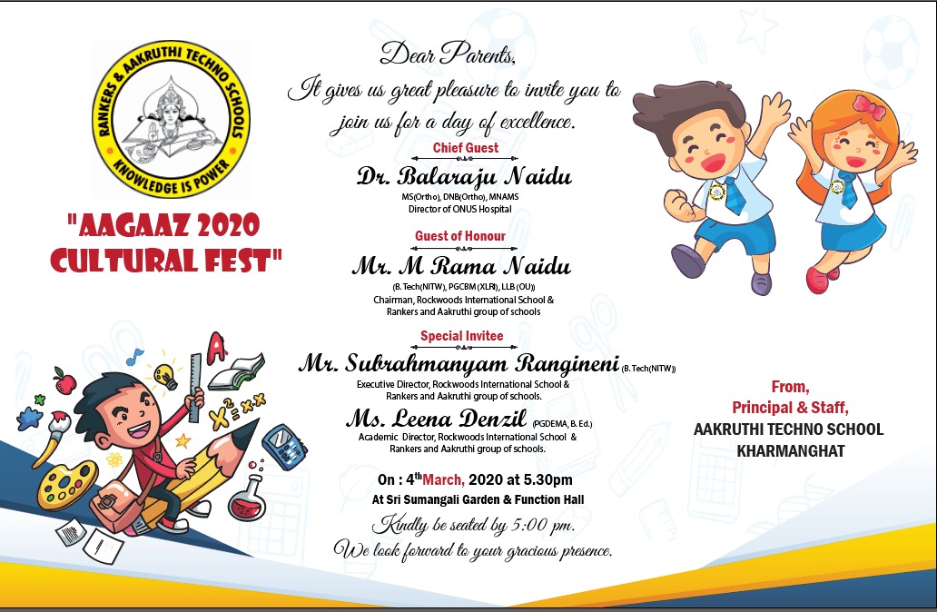 Dr. Balaraju Naidu attended the “Aagaaz 2020 Cultural Fest”, the annual day celebrations of Aakruthi I Techno School, Karmanghat, as the Chief Guest.