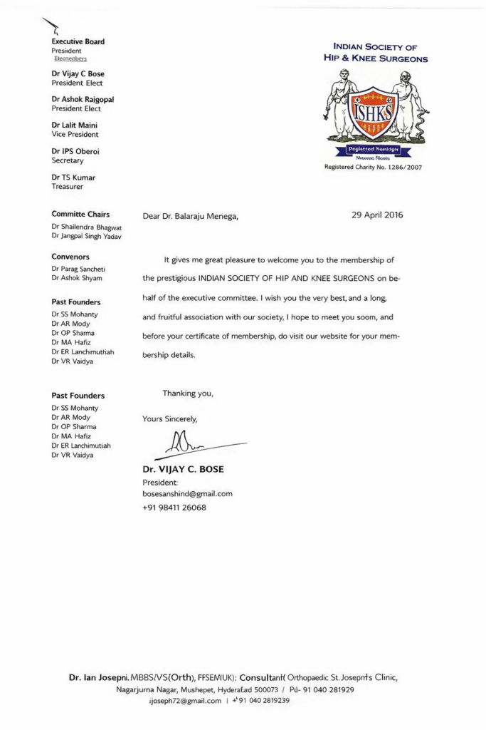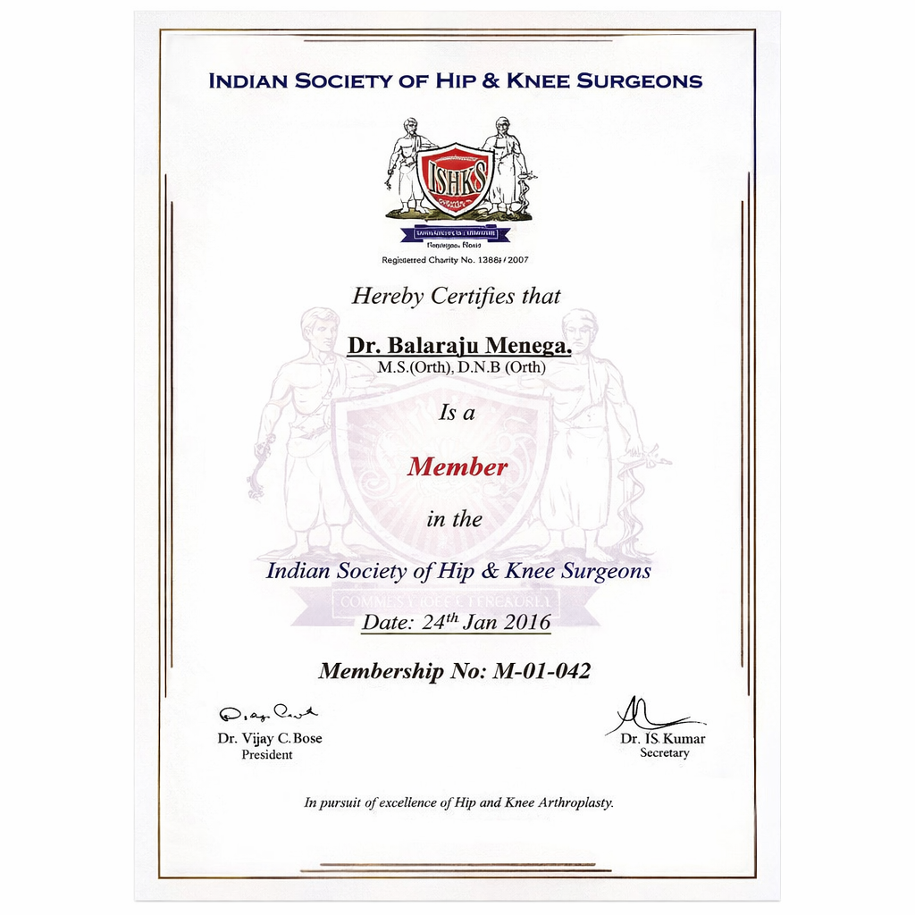 Recognized as a certified member of the Indian Society of Hip & Knee Surgeons, reflecting commitment to excellence in hip and knee arthroplasty and evidence-based orthopedic practice.