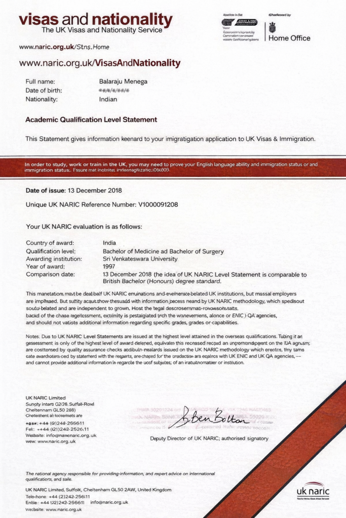 Official confirmation of MBBS qualification being equivalent to a UK Bachelor (Honours) degree, validating international academic standards for global clinical and professional recognition.