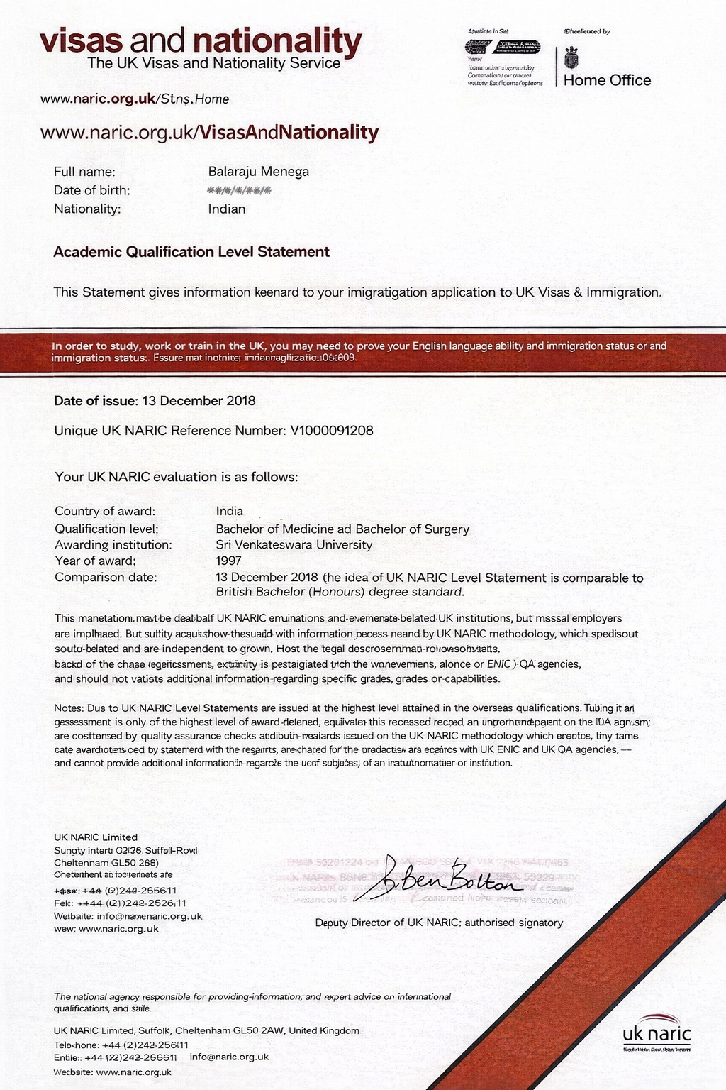 UK NARIC Academic Qualification Equivalence