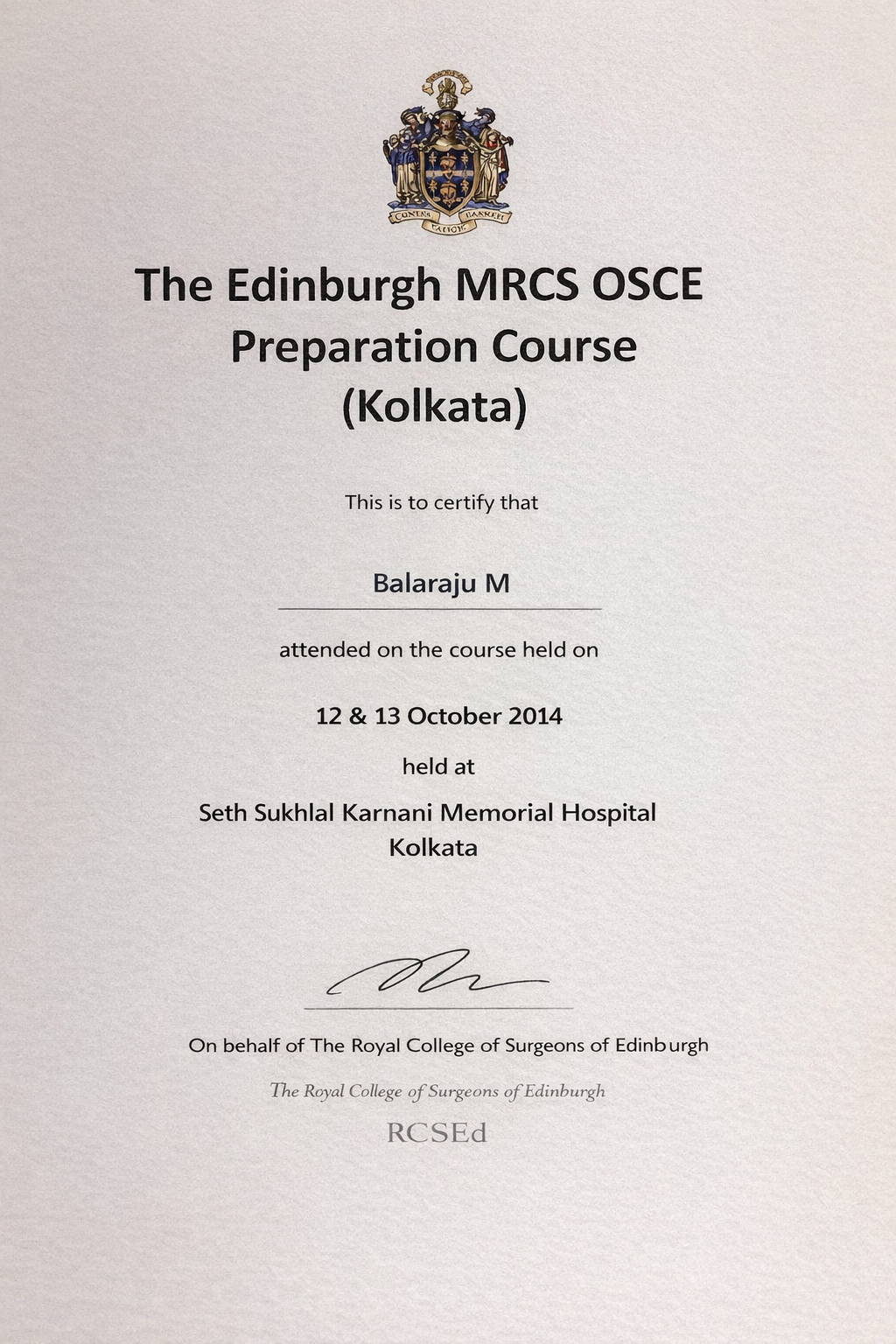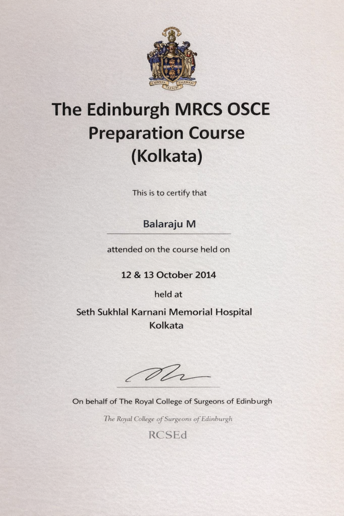 Completed advanced MRCS OSCE preparation under the Royal College of Surgeons of Edinburgh, strengthening clinical examination skills and surgical competency.