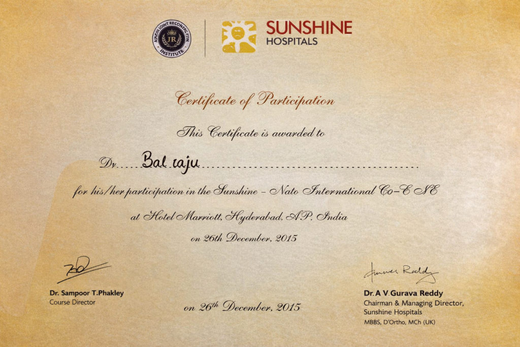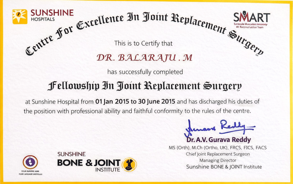 Successfully completed an intensive fellowship in joint replacement surgery at the Centre for Excellence in Joint Replacement, Sunshine Hospitals, demonstrating advanced clinical competence, surgical precision, and professional integrity.