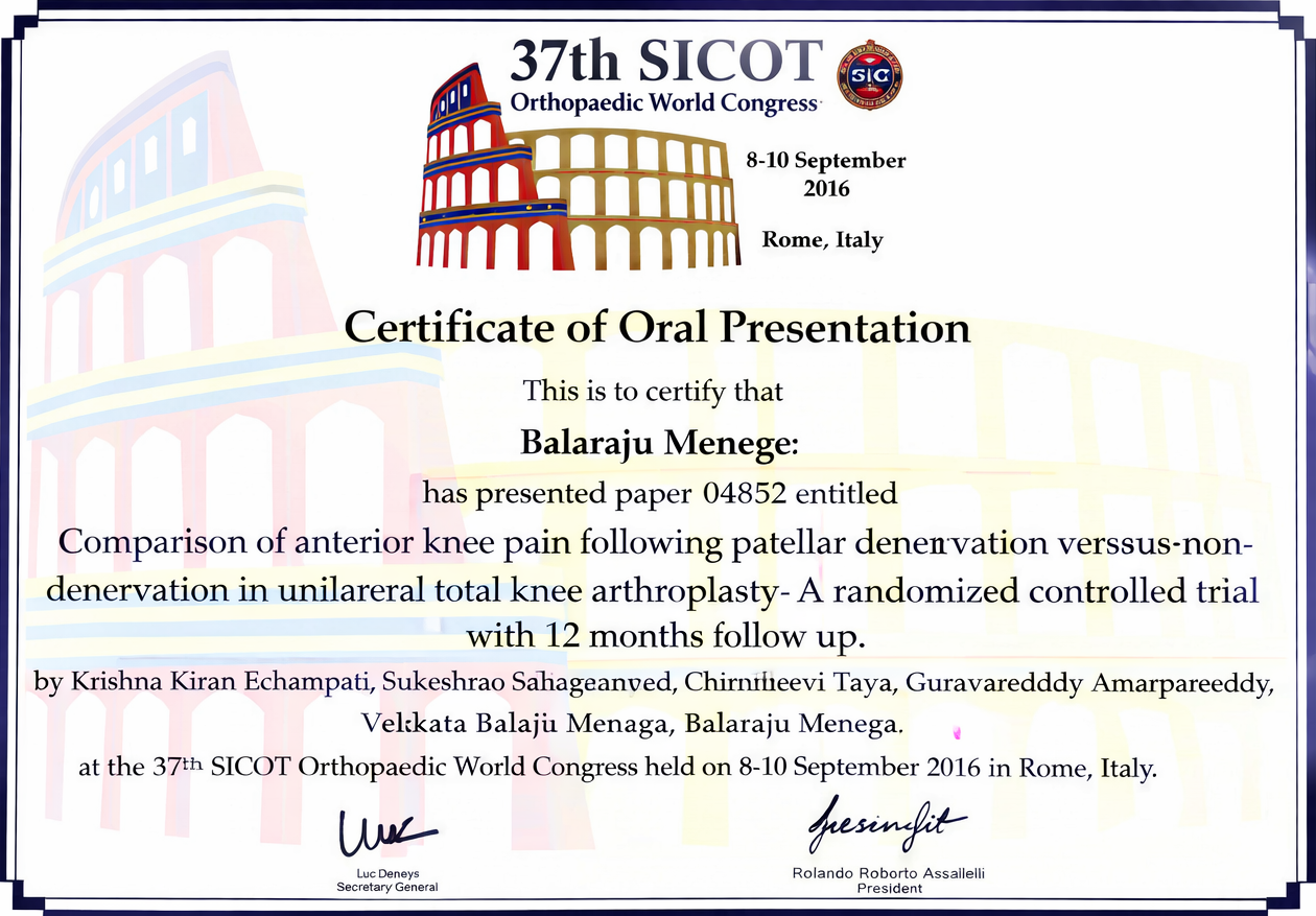 Presented original clinical research at the 37th SICOT Orthopaedic World Congress, comparing outcomes of patellar denervation versus non-denervation in unilateral total knee arthroplasty through a randomized controlled trial with 12-month follow-up.