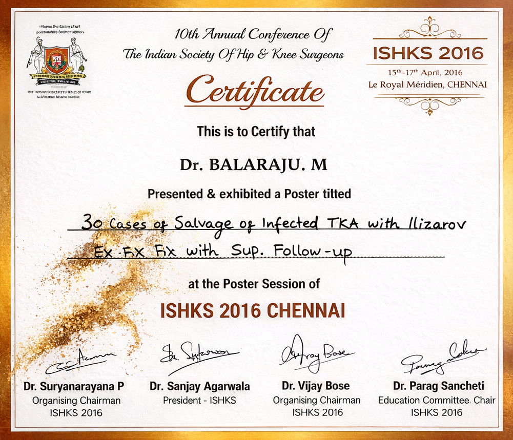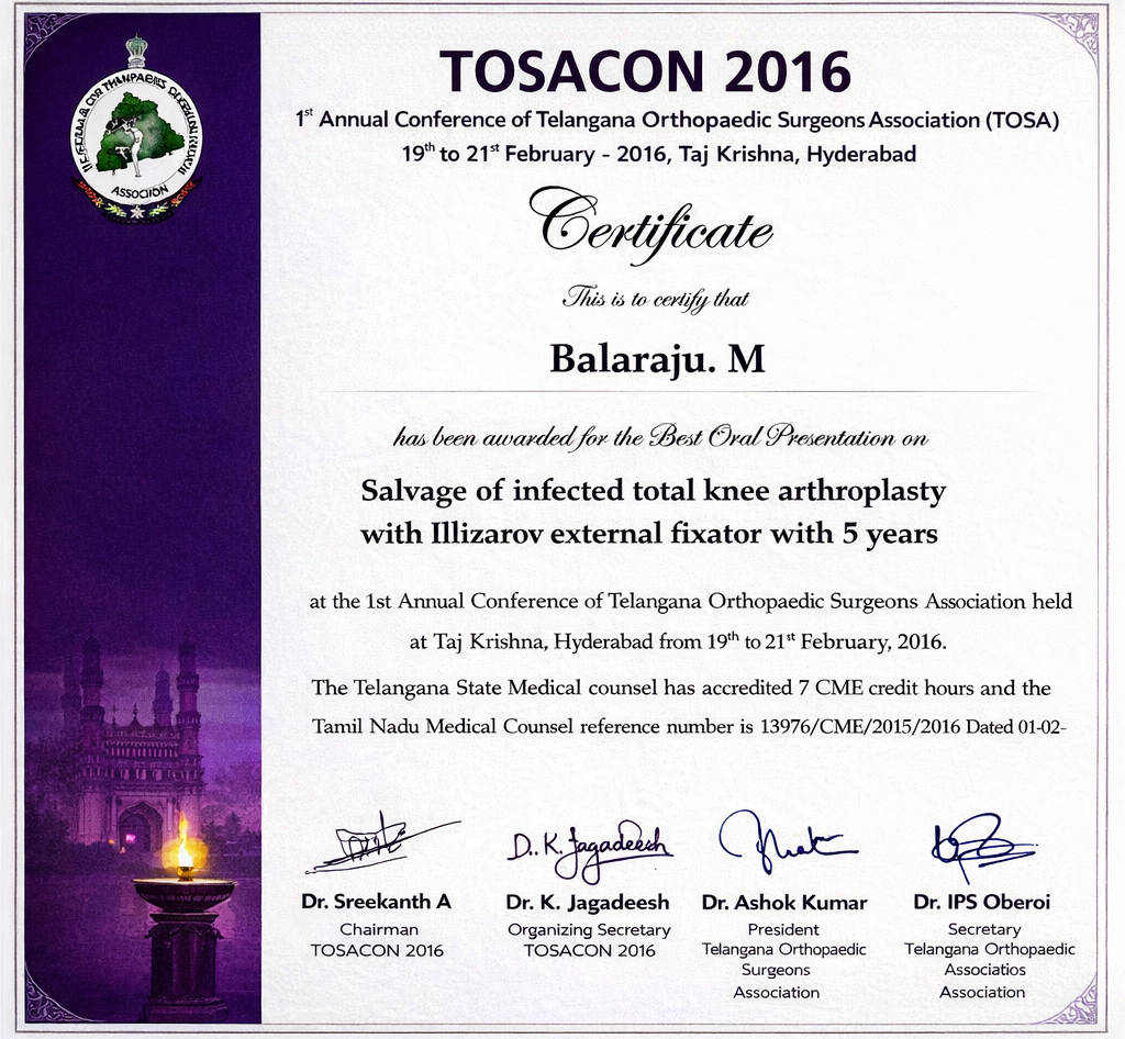 Awarded Best Oral Presentation at the 1st Annual Conference of the Telangana Orthopaedic Surgeons Association for presenting long-term outcome data on salvage of infected total knee arthroplasty using the Ilizarov external fixator.