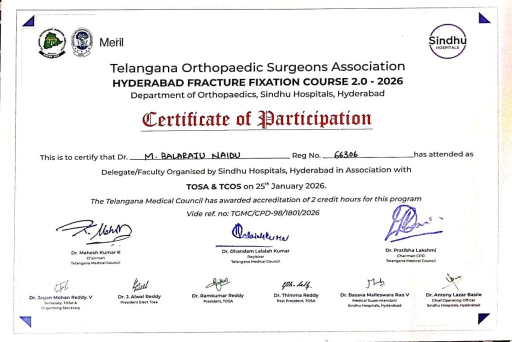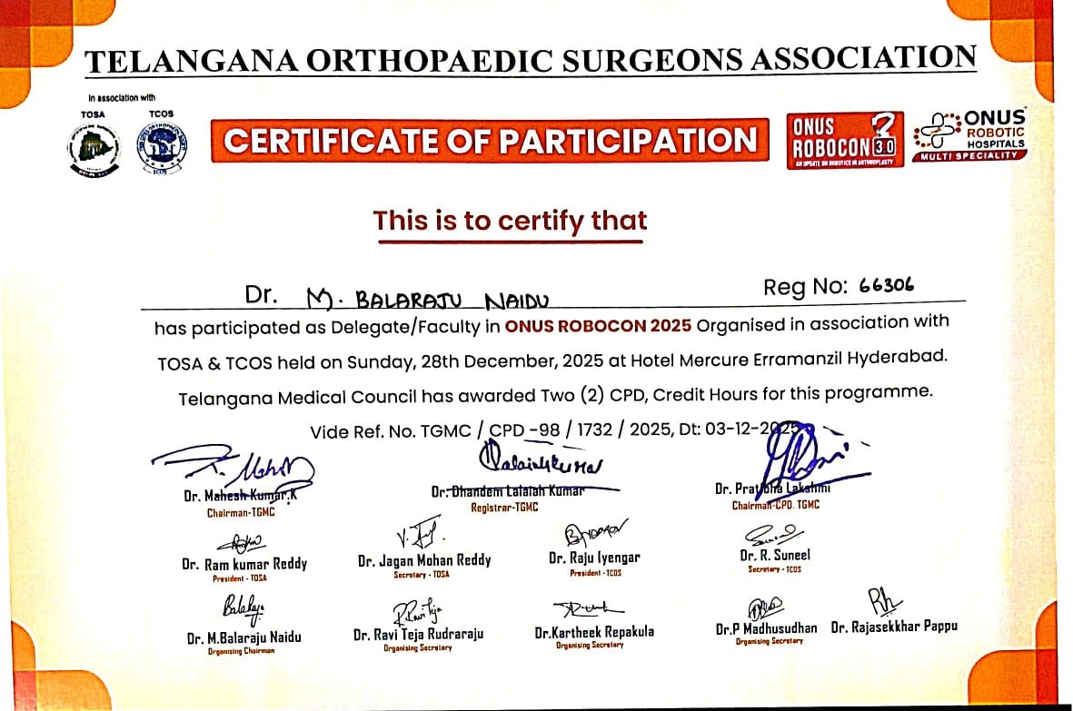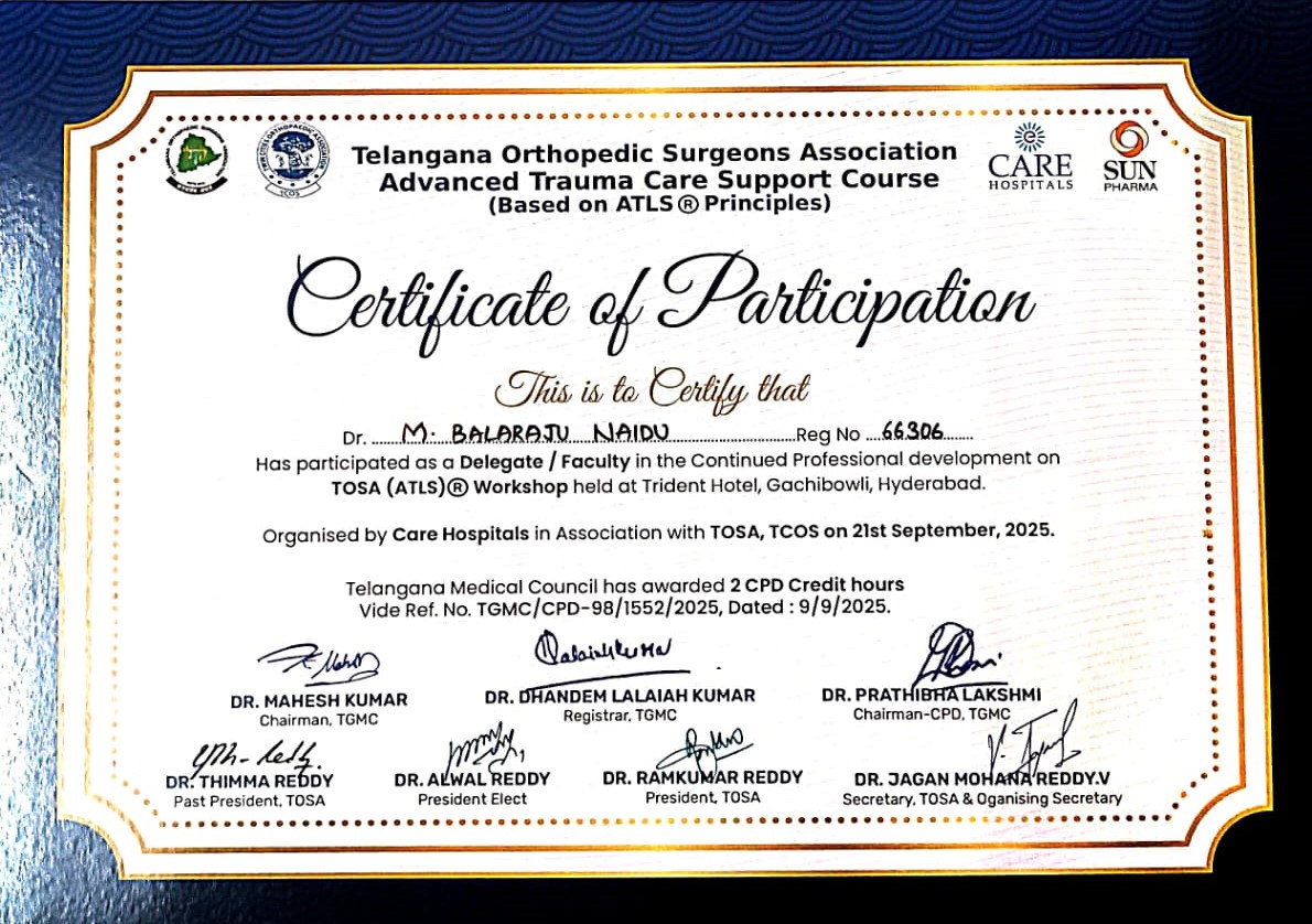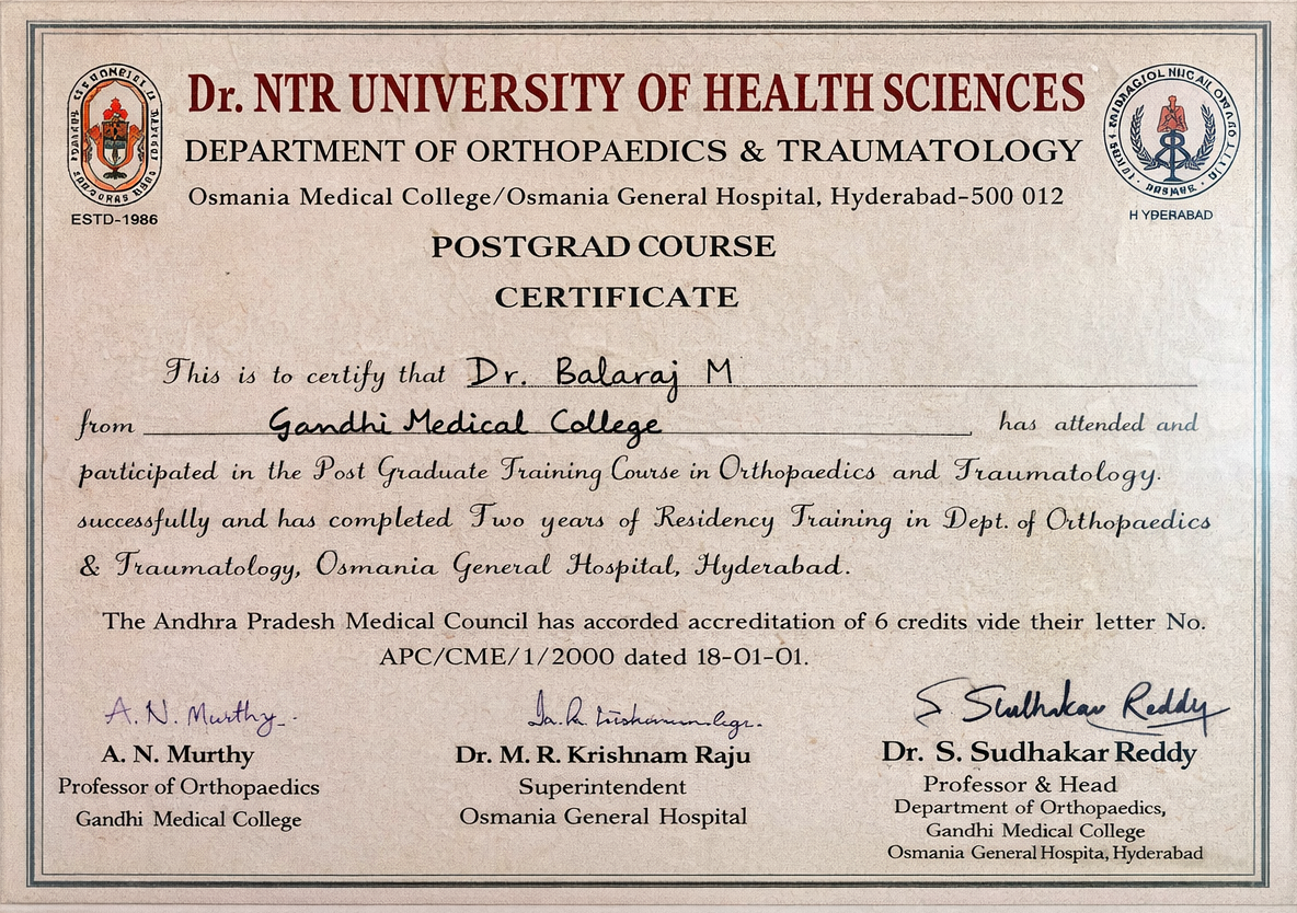 Certified completion of structured postgraduate clinical training in Orthopaedics and Traumatology under Dr. NTR University of Health Sciences, forming the foundation for advanced surgical practice and academic excellence.