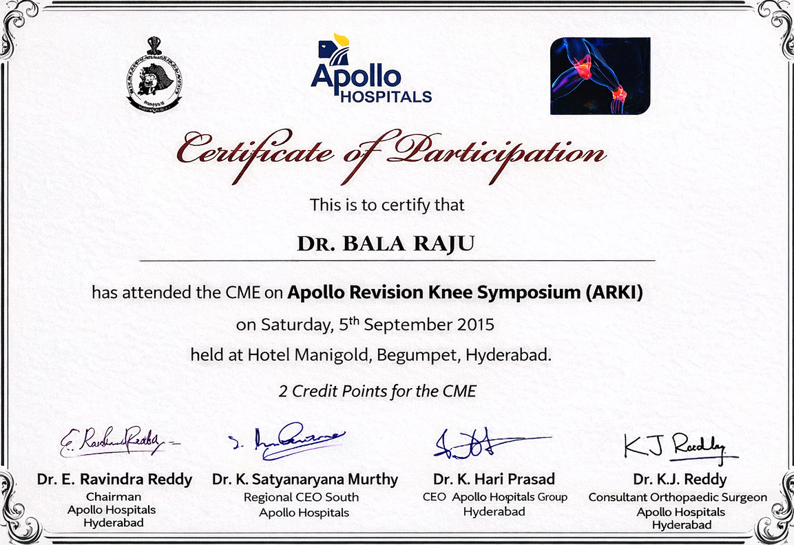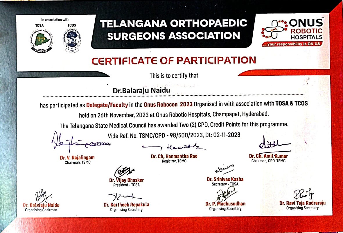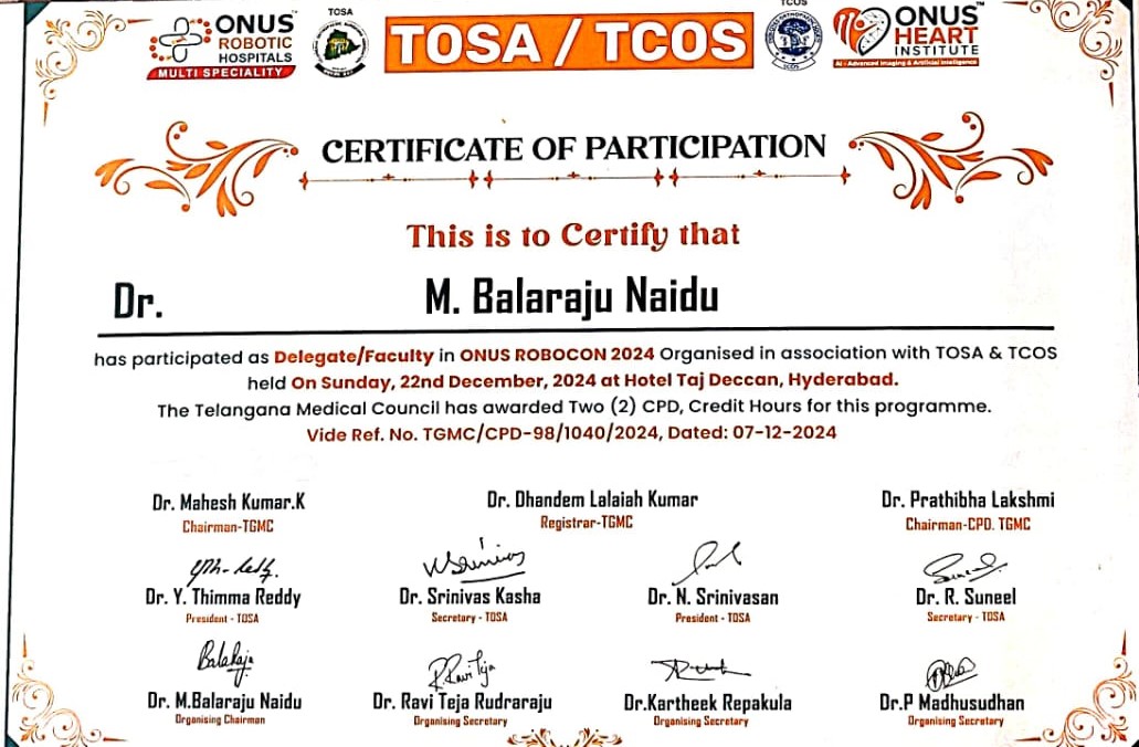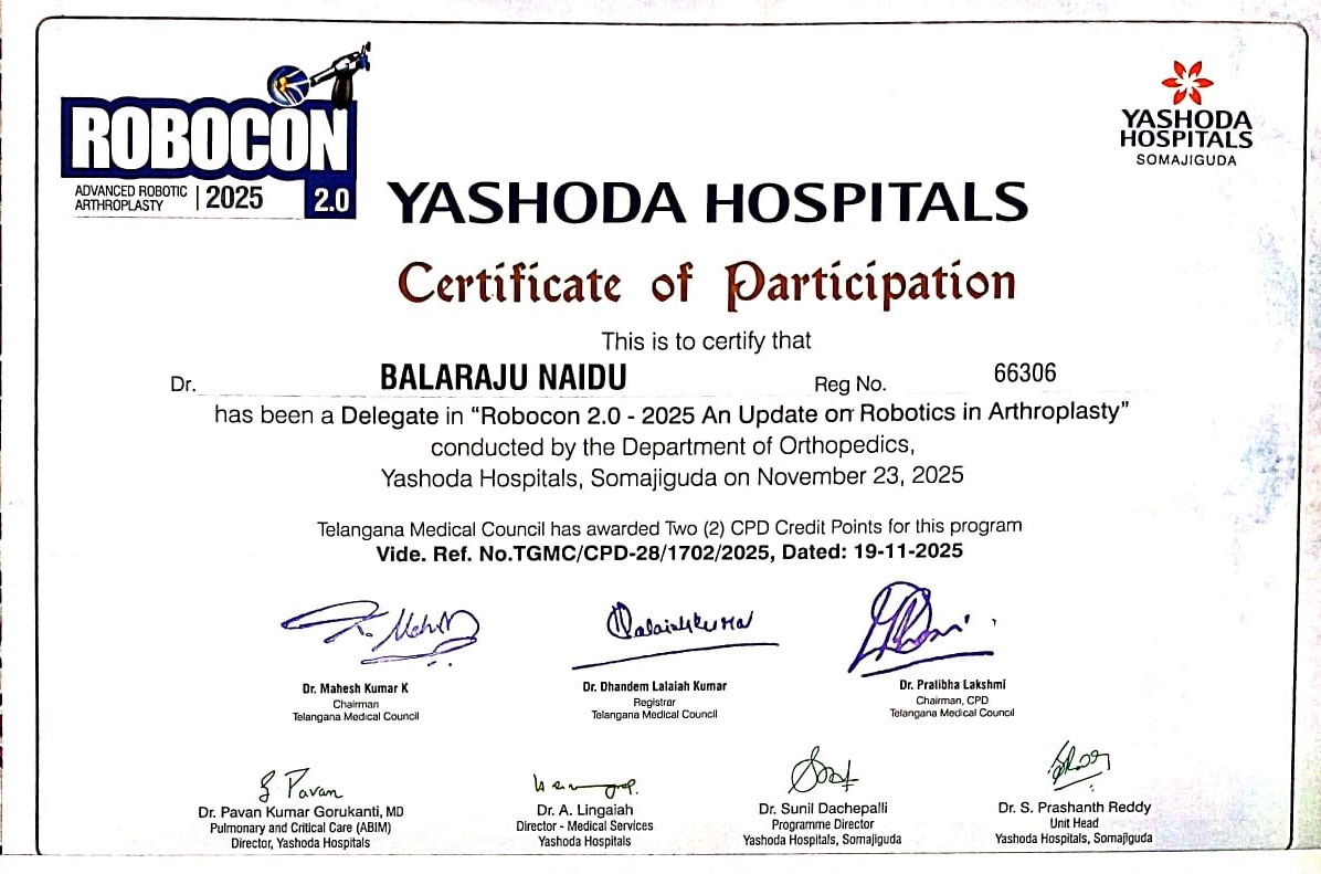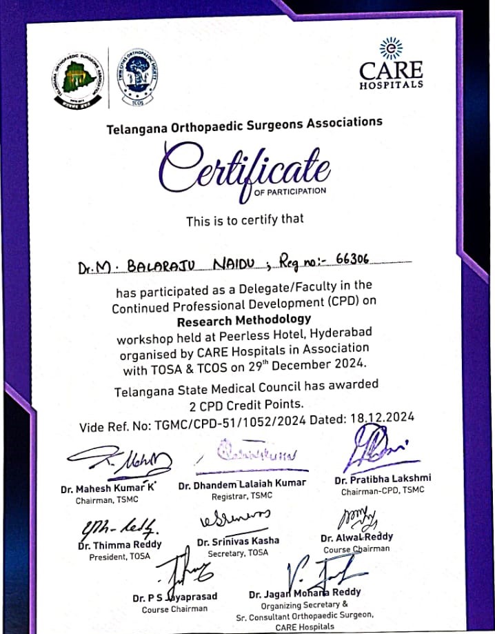 Certified completion of structured postgraduate clinical training in Orthopaedics and Traumatology under Dr. NTR University of Health Sciences, forming the foundation for advanced surgical practice and academic excellence.