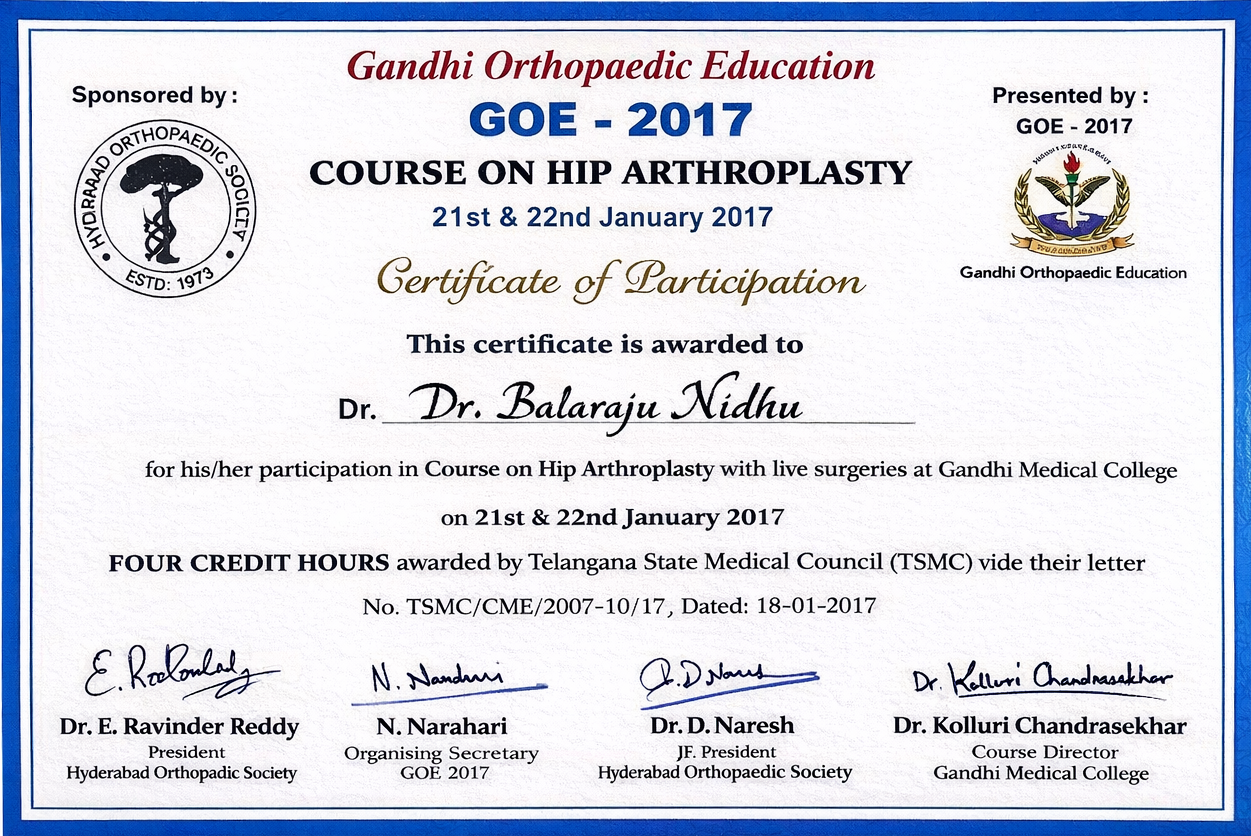 Completed certified training in hip arthroplasty at Gandhi Medical College through the GOE 2017 program, with hands-on learning and live surgical demonstrations focused on contemporary hip replacement techniques.