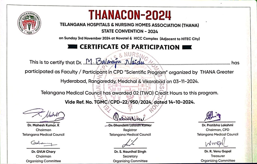 Issued by the Telangana State Medical Council, certifying good professional standing, valid medical registration, and adherence to ethical and regulatory standards required for clinical practice.