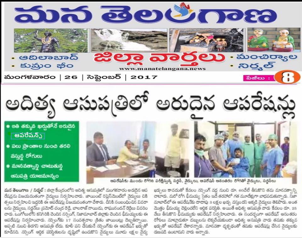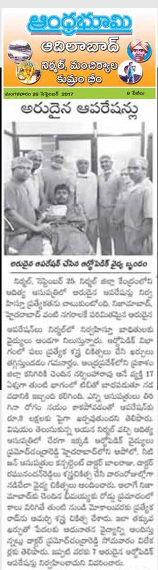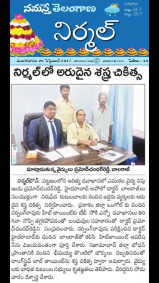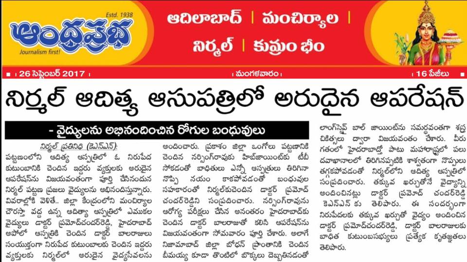 On the auspicious occasion of Dussehra, we celebrate new beginnings and successful outcomes in healthcare. It was a proud and delightful moment to share the success of two complex Hip Joint Replacement surgeries performed at Sri Aditya Multi Speciality Hospital, Nirmal, which also received coverage in print and electronic media.