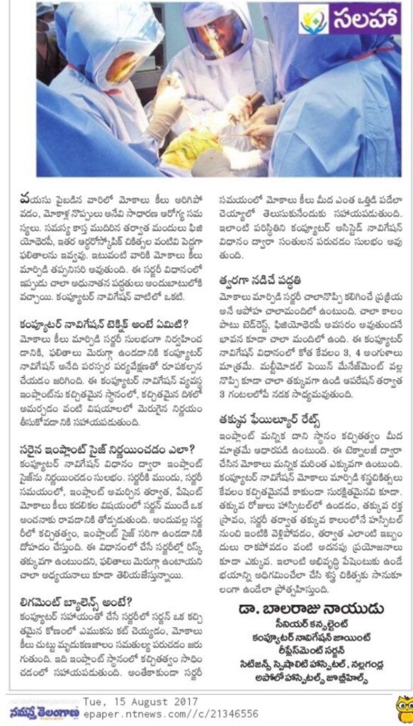 It is a proud moment to share that my article on Computer Navigation Knee Joint Replacement Surgery was featured in the Namaste Telangana Newspaper.