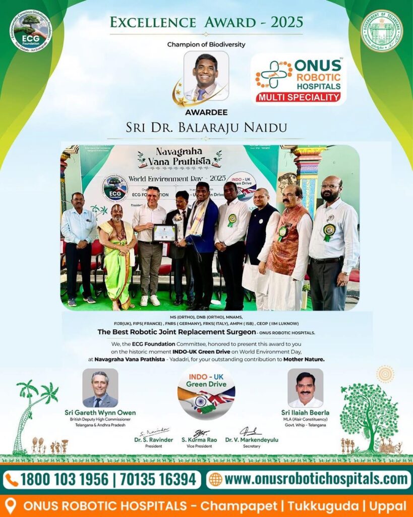 Dr. M. Balaraju Naidu was proudly recognized as the “Best Robotic Joint Replacement Surgeon” by the ECG Foundation during the prestigious Navagraha Vana Prathista – World Environment Day 2025 celebrations held at Yadadri.