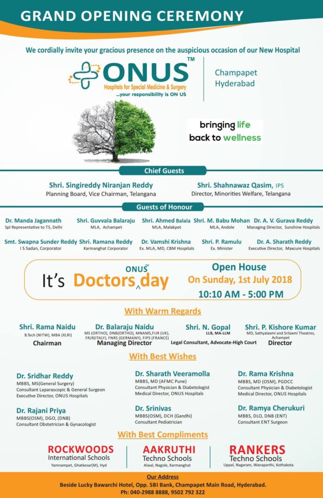The Grand Opening Ceremony of ONUS Hospitals for Special Medicine & Surgery at Champapet, Hyderabad was successfully held on July 1st, 2018.