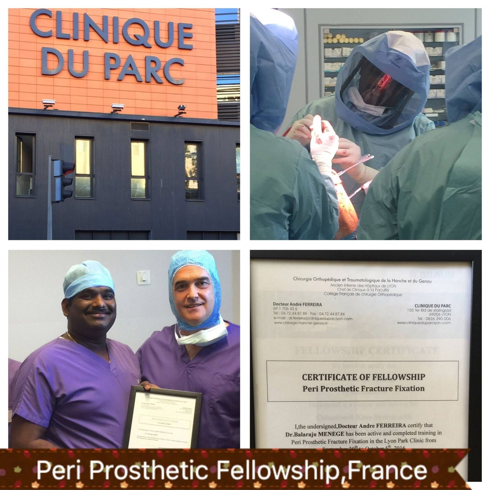 Dr. Balaraju Naidu completed an advanced International Fellowship in Peri Prosthetic Fracture Fixation in Lyon, France, receiving specialized training in managing complex fractures around joint replacement implants.