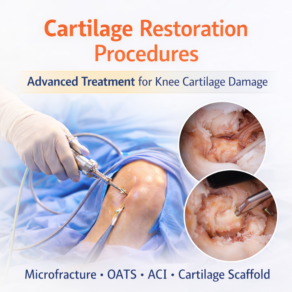 Cartilage Restoration Procedures are advanced orthopedic techniques designed to repair or regenerate damaged knee cartilage. Cartilage injuries commonly occur due to sports trauma, accidents, early arthritis, or long-standing joint instability.