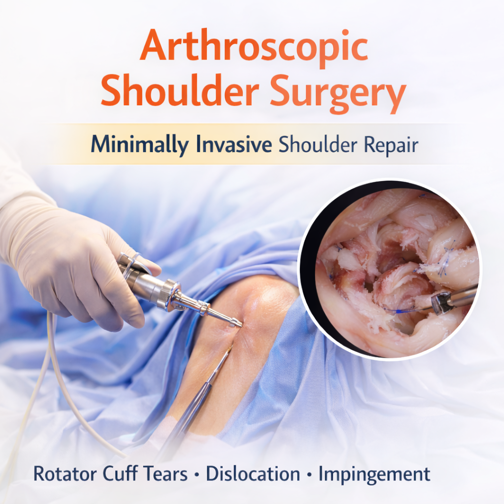Arthroscopic Shoulder Surgery is a minimally invasive keyhole procedure used to diagnose and treat various shoulder joint problems. Using a high-definition camera (arthroscope) and specialized instruments, the surgeon repairs damaged tissues through small incisions instead of large open cuts.