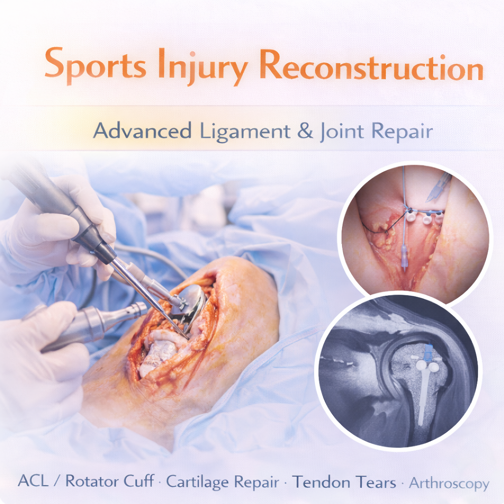 Sports Injury Reconstruction refers to advanced surgical procedures performed to repair and restore damaged ligaments, tendons, cartilage, and joints caused by sports-related trauma. These injuries are common in athletes and active individuals involved in high-impact or pivoting activities.