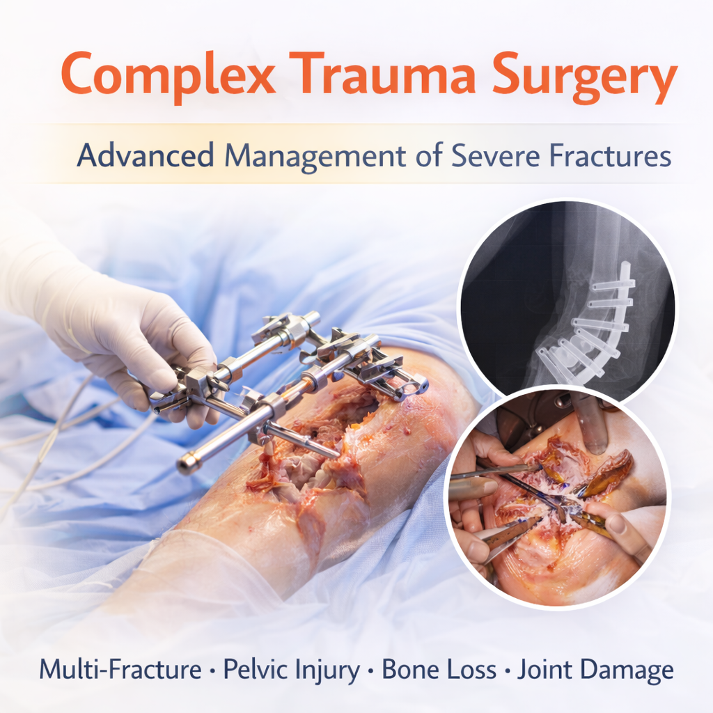 Complex Trauma Surgery focuses on the treatment of severe fractures and multiple injuries resulting from high-impact accidents such as road traffic injuries, falls from height, industrial trauma, and sports injuries.