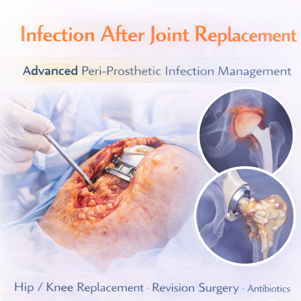 Infection After Joint Replacement (Peri-Prosthetic Joint Infection – PJI) is a serious but treatable complication that can occur after hip or knee replacement surgery. It may develop early (within weeks), delayed (within months), or even years after the procedure.