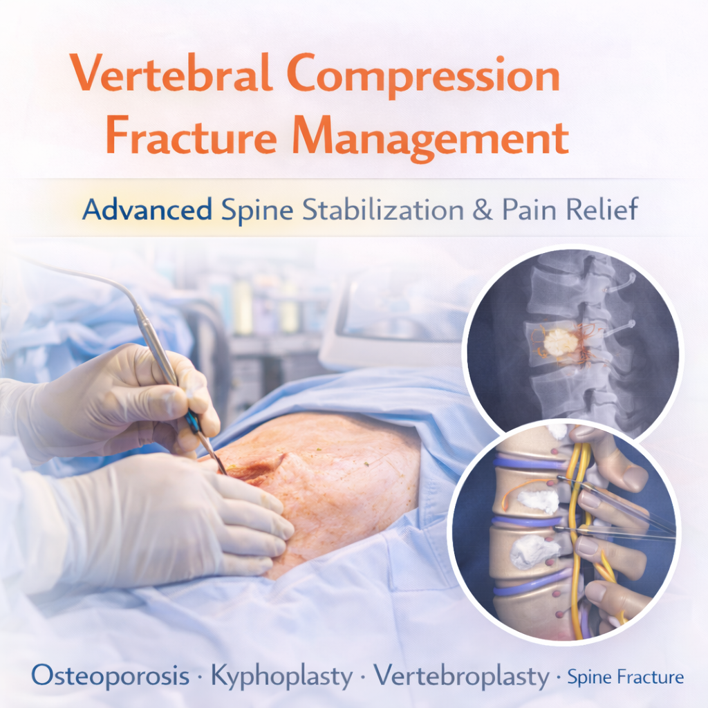 Vertebral Compression Fracture (VCF) Management focuses on treating fractures of the spinal vertebrae, most commonly caused by osteoporosis, trauma, or cancer-related bone weakness. These fractures can lead to severe back pain, reduced mobility, height loss, and spinal deformity (kyphosis).