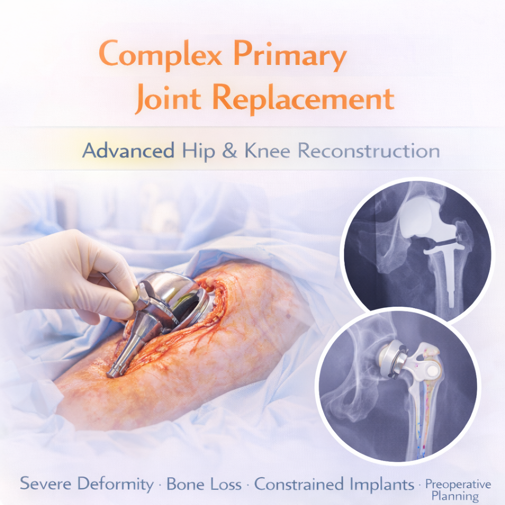 Complex Primary Joint Replacement refers to advanced joint replacement surgery performed in patients with severe deformity, bone loss, stiffness, previous trauma, or challenging anatomy — even though it is their first joint replacement.