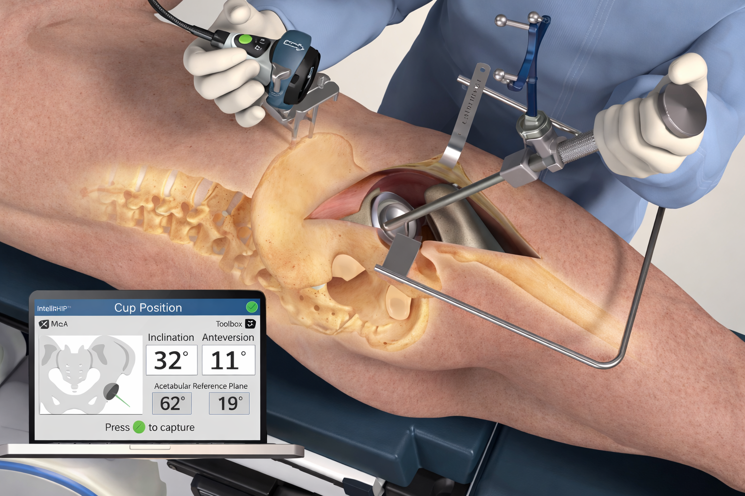 In navigation-guided hip replacement, a computer system continuously tracks the position of the pelvis, femur, and surgical instruments during surgery. The system provides real-time visual feedback to the surgeon, enabling precise execution of every step.