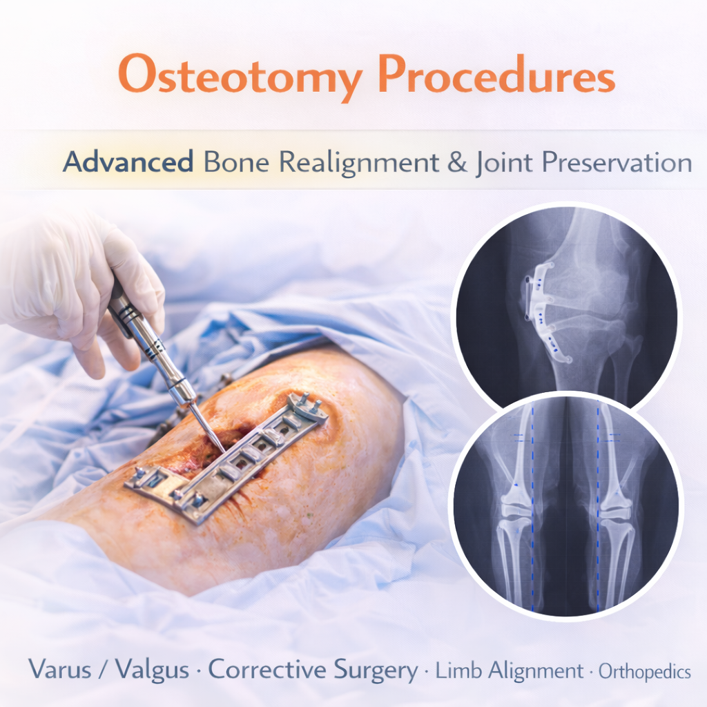 Osteotomy Procedures are advanced orthopedic surgeries performed to cut and realign bone in order to correct deformity, relieve pain, and restore joint mechanics. These procedures are commonly used to treat knee, hip, and limb alignment problems, especially in younger and active patients who are not ideal candidates for joint replacement.
